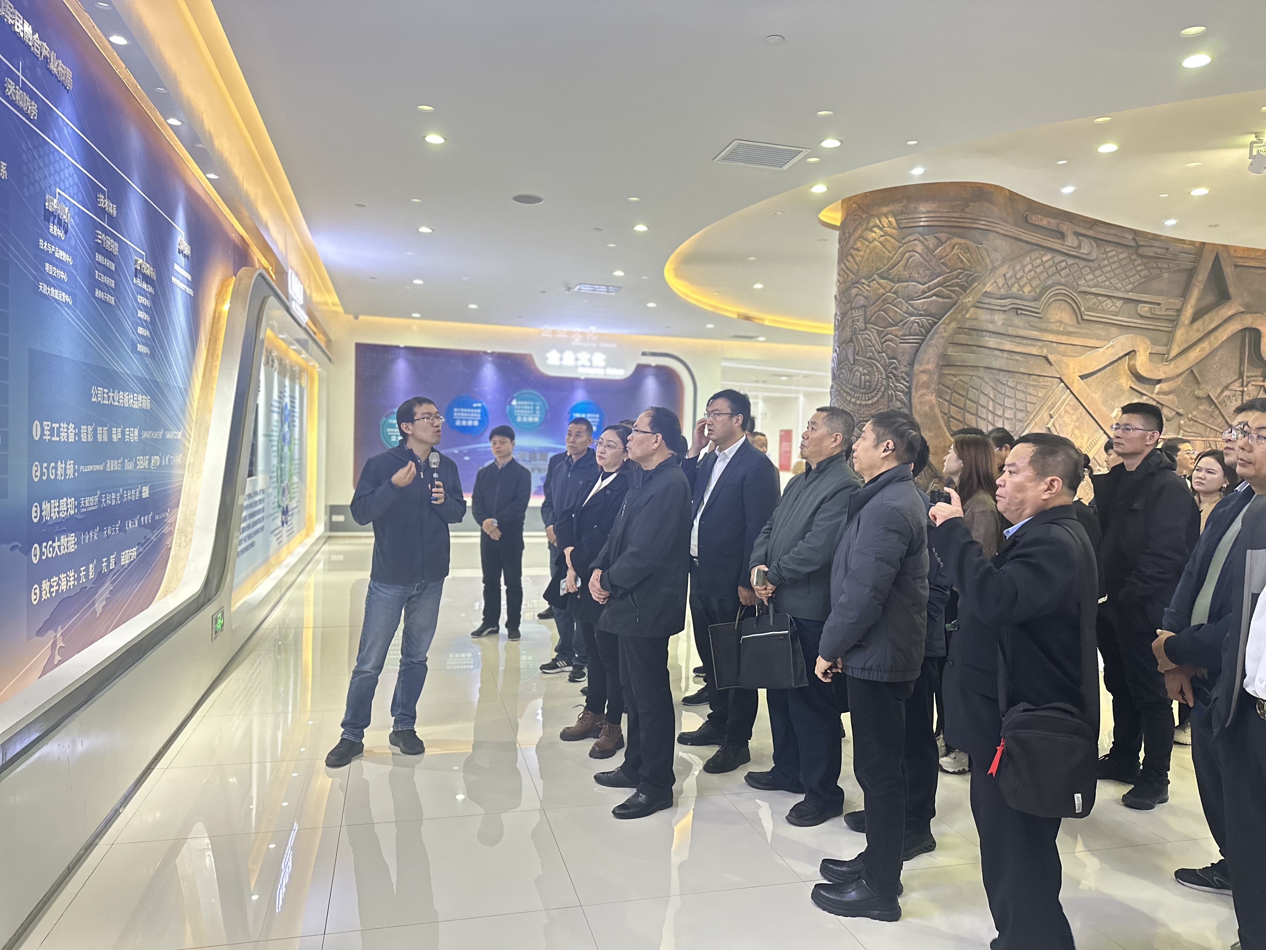 在公司文化展廳和產(chǎn)品展廳,天偉電子國際市場(chǎng)部總經(jīng)理馬濤向學(xué)員們介紹了天和防務(wù)的發(fā)展歷程、業(yè)務(wù)領(lǐng)域以及在軍民兩用科技領(lǐng)域所取得的成就,近距離觀(guān)看了便導指揮系統、邊海防雷達、水下無(wú)人自主航行器、云脈智能穿戴設備等科技創(chuàng )新產(chǎn)品。