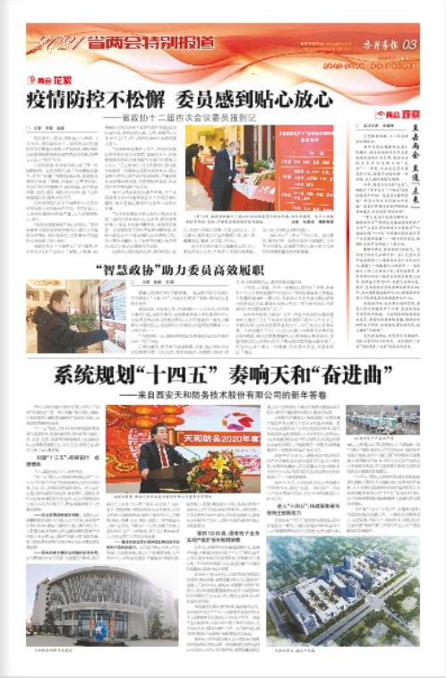 2021年1月25日,由陜西省政協(xié)主管、主辦的《各界導報》,以“系統規劃‘十四五’ 奏響天和‘奮進(jìn)曲’——來(lái)在西安天和防務(wù)技術(shù)股份有限公司的新年答卷”為題,以1/2版的篇幅對天和防務(wù)“十三五”發(fā)展成果、“十四五”系統規劃進(jìn)行了報道?,F轉載如下: